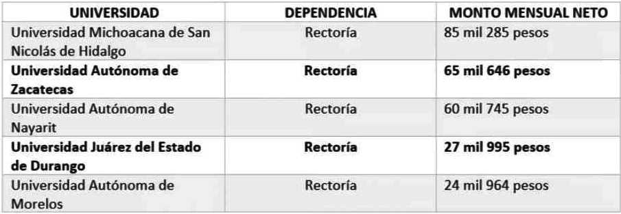 Otros puestos de confianza como algunas direcciones administrativas, tienen un sueldo mensual neto por titular de 30 mil 294 pesos. En tanto, el responsable de la coordinación de Planeación, Infraestructura y Fortalecimiento Universitario, percibe 31 mil 470 pesos cada mes. Los directores de preparatorias, facultades, escuelas e institutos, tienen un salario de 32 mil 508 pesos mensuales.