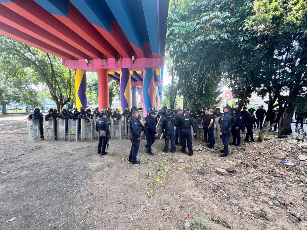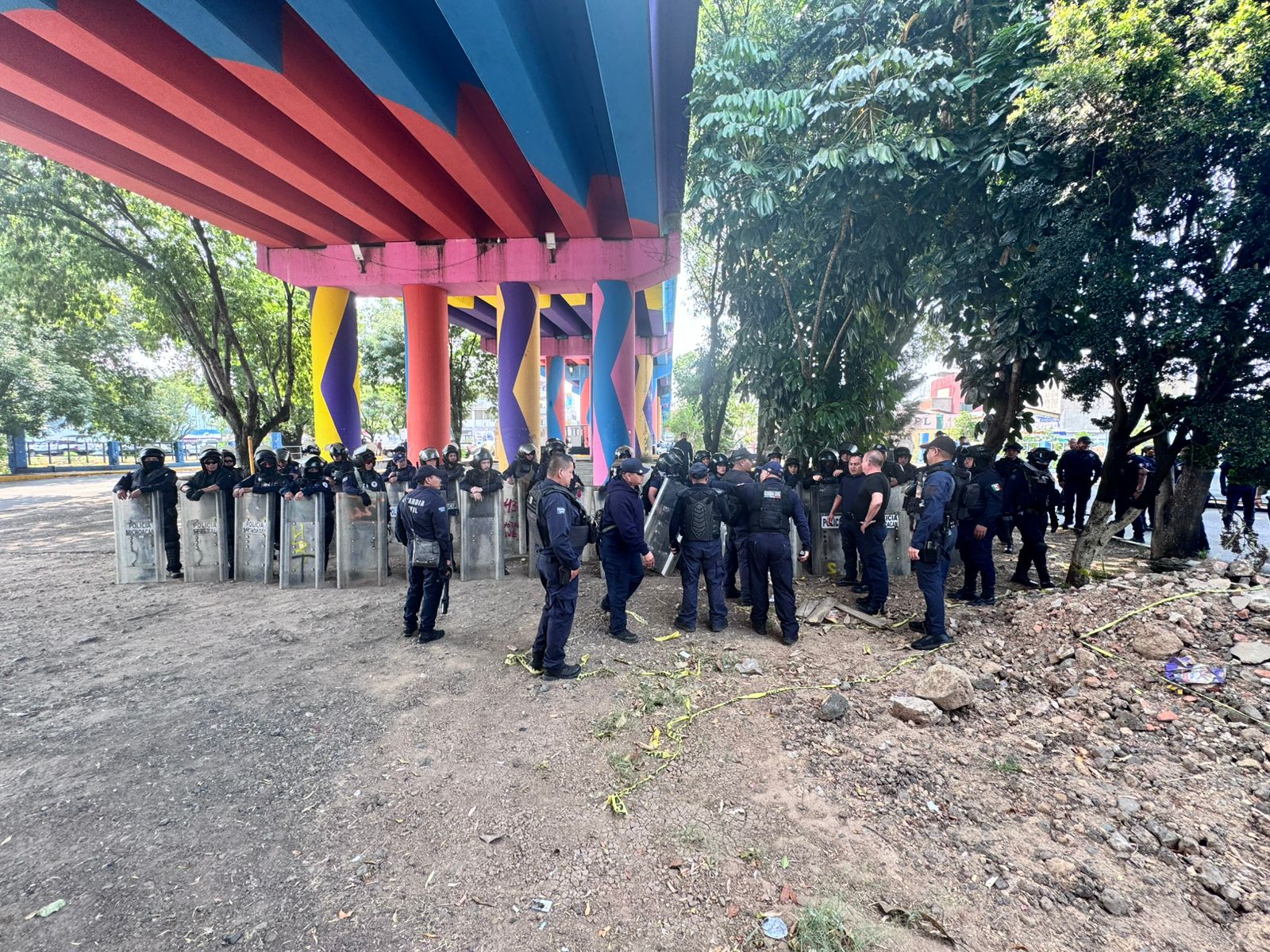 Cerca de 15 unidades de la Guardia Civil del gobierno estatal esperan a los profesores del ala oficial de la CNTE que se están movilizando en Morelia y que se dirigen hacia las vías del tren.