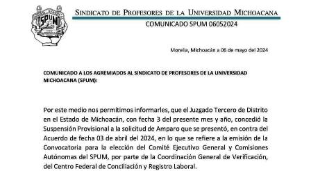 Habiendo obtenido el fallo favorable, este Lunes 6 de Mayo la dirigencia actual del SPUM ha notificado de manera oficial al respecto a todos los sindicalizados mediante un documento que dice: «por este medio nos permitimos informarles que el Juzgado Tercero de Distrito en el estado de Michoacán con fecha 3 del presente mes y año, concedió la suspensión provisional a la solicitud de amparo presentada por el área jurídica de este sindicato, en lo que se refiere a la emisión de la convocatoria para la elección del nuevo Comité Ejecutivo General y Comisiones Autónomas del SPUM», por lo que habrá de ser emitida la nueva y definitiva convocatoria para elección.