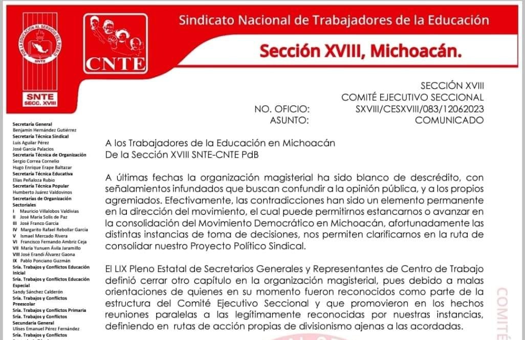 También acusa que en los últimos meses se ha intentado dividir al magisterio adherido a la CNTE Poder de Base, pero aseguran que ratifican su compromiso irrenunciable contra lo que califican como corrupción, ahora que este gremio entra en su fase de renovación de dirigencia estatal.