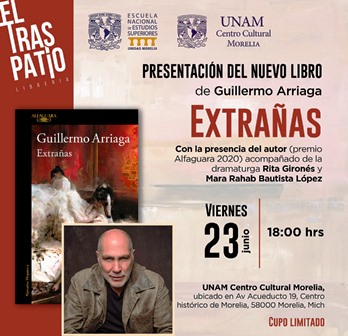 El gran escritor, guionista, productor y director de cine mexicano Guillermo Arriaga llegará a la UNAM Centro Cultural Morelia el próximo viernes 23 de junio a las 18 h, para presentar su nuevo libro “Extrañas”. Esta actividad es organizada por El traspatio librería y la UNAM Centro Cultural Morelia, de la Escuela Nacional de Estudios Superiores, Unidad Morelia.