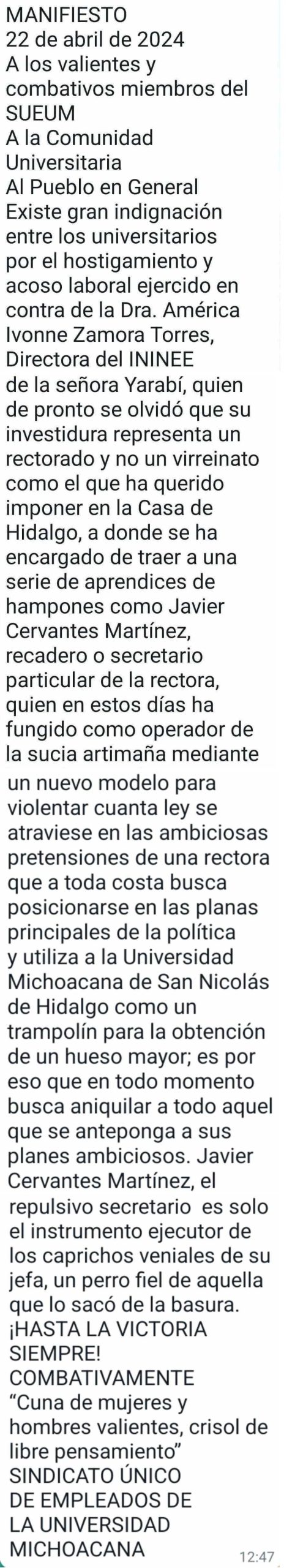 En este manifiesto, el dirigente del SUEUM, Eduardo Tena Flores, acusa que «la señora Yarabí de pronto se olvidó que su investidura representa un rectorado y no un virreinato como el que hay querido imponer en la Casa de Hidalgo», a donde se ha encargado desde traer al personal que tenía cercano de colaboradores en la Secretaría de Educación estatal que es de donde proviene.