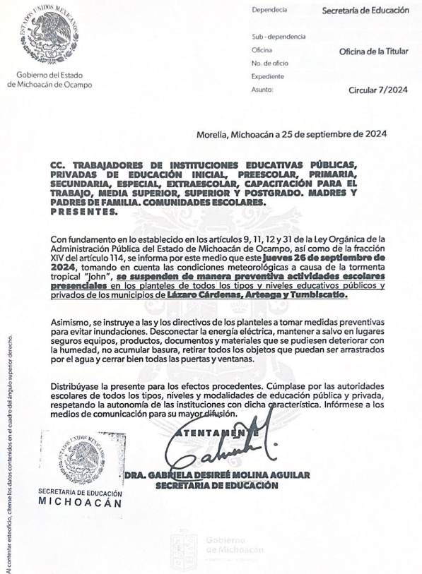 Ante la llegada de la tormenta tropical John y el pronóstico de fuertes lluvias y vientos, la Secretaría de Educación del Estado (SEE) informa la suspensión de clases presenciales en todos los niveles educativos, tanto públicos como privados, el día jueves 26 de septiembre de 2024, en los municipios de Lázaro Cárdenas, Arteaga y Tumbiscatío.