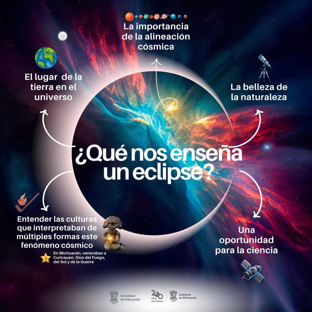 Morelia, Michoacán, 7 de abril de 2024.- La Secretaría de Educación del Estado (SEE) hace un llamado a las comunidades escolares a disfrutar de manera segura el eclipse de sol que se podrá observar parcialmente en Michoacán mañana lunes 8 de abril.