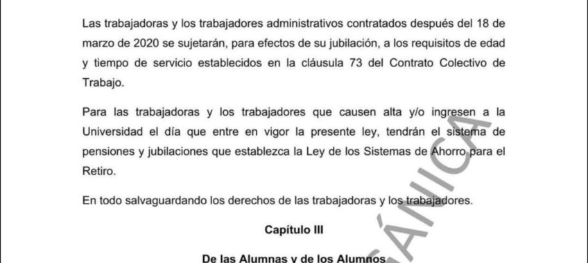 Es así que establece que en general «para las trabajadoras y los trabajadores que causen alta y/o ingresen a la Universidad el día que entre en vigor la presente ley tendrán qué regirse bajo el sistema de pensiones y jubilaciones que establezca la Ley de los Sistemas de Ahorro para el Retiro».