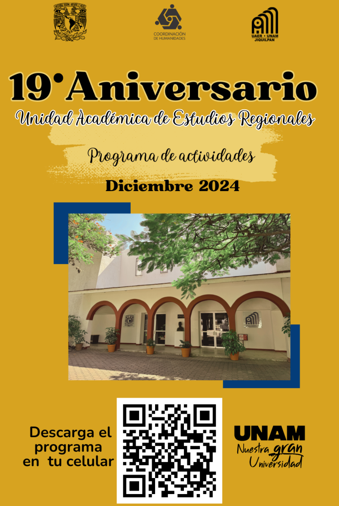 Con el fin de conmemorar el 19 aniversario de la Unidad Académica de Estudios Regionales (UAER) de la Coordinación de Humanidades (CoHu)- Universidad Nacional Autónoma de México (UNAM), la cual fue creada el 1 de diciembre del 2005, se realizarán actividades académicas y culturales enmarcadas en este aniversario, del 2 al 6 de diciembre de 2024.