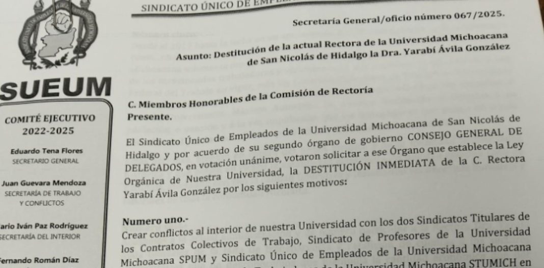 El Sindicato Único de Empleados de la Universidad Michoacana (SUEUM) ha hecho entrega a los integrantes de la Comisión de Rectoría de la solicitud para destituir a la rectora Yarabí Ávila González haberse apropiado del proceso de reforma a Ley Orgánica y realizado una consulta dejando fuera a los sectores de trabajadores, y sin tomar en cuenta sus opiniones.