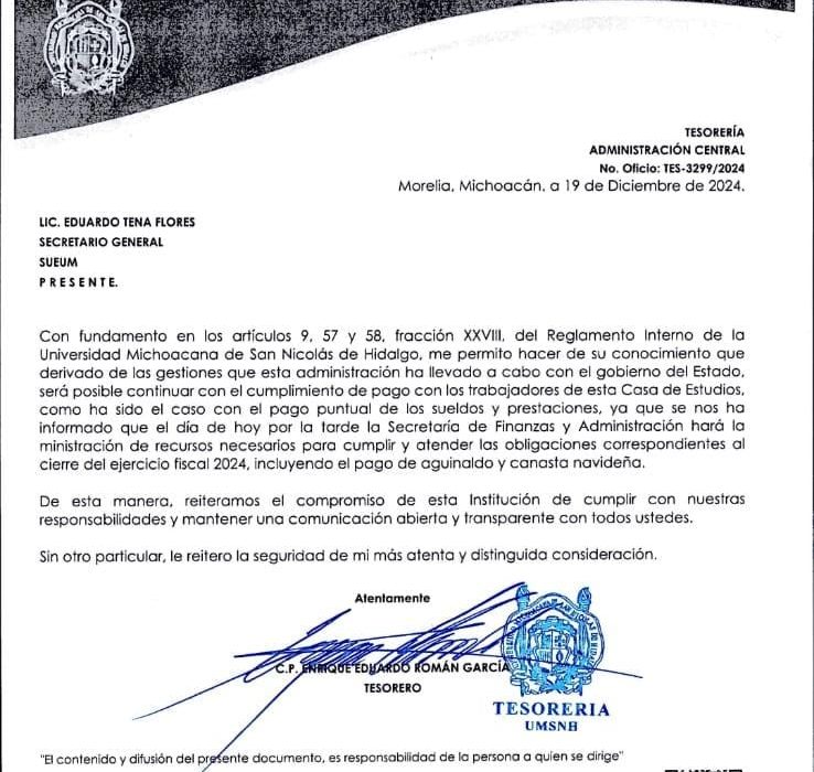 Con la transferencia de recursos, el Gobierno de Michoacán garantiza el pago del aguinaldo y la segunda quincena de diciembre para personal de la Universidad Michoacana de San Nicolás de Hidalgo (UMSNH).