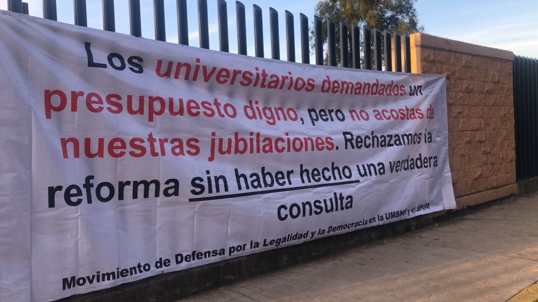 «Los universitarios demandamos un presupuesto digno para la institución nicolaita pero no a costa de nuestras jubilaciones», es la consigna central de los sueumistas que reza en una enorme lona colocada en el inmueble.