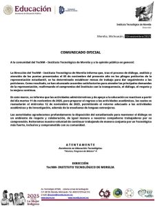 En ese mismo comunicado emitido esta tarde la autoridad del Instituto «reconoce la disposición del estudiantado para mantener el diálogo en un ambiente de respeto y colaboración para trabajar por un TEC de Morelia más fuerte inclusivo y comprometido con su comunidad».