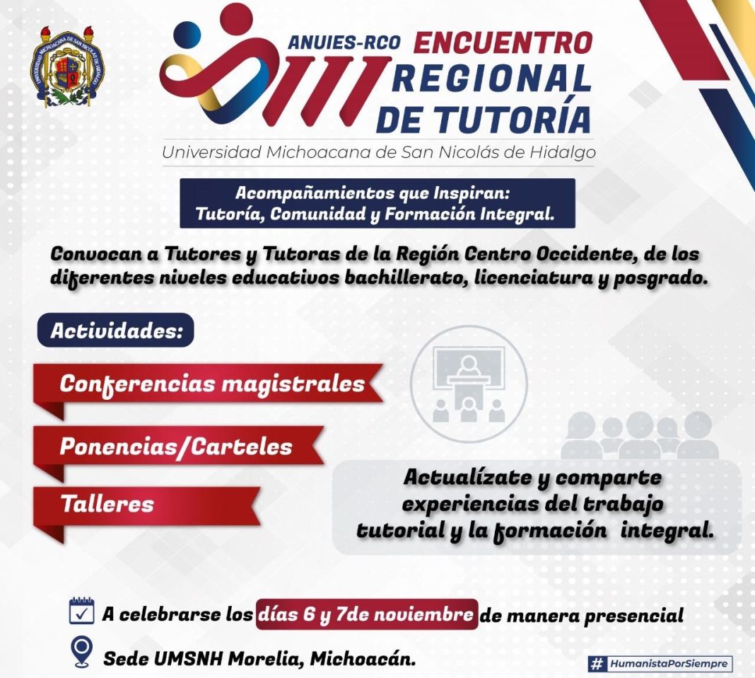 La Universidad Michoacana de San Nicolás de Hidalgo (UMSNH) y la Red de Tutorías de la Región Centro Occidente de la Asociación Nacional de Universidades e Instituciones de Educación Superior (ANUIES) invitan al VIII Encuentro Regional de Tutoría «Acompañamientos que Inspiran: Tutoría, Comunidad y Formación Integral», que se llevará a cabo el próximo mes de noviembre.