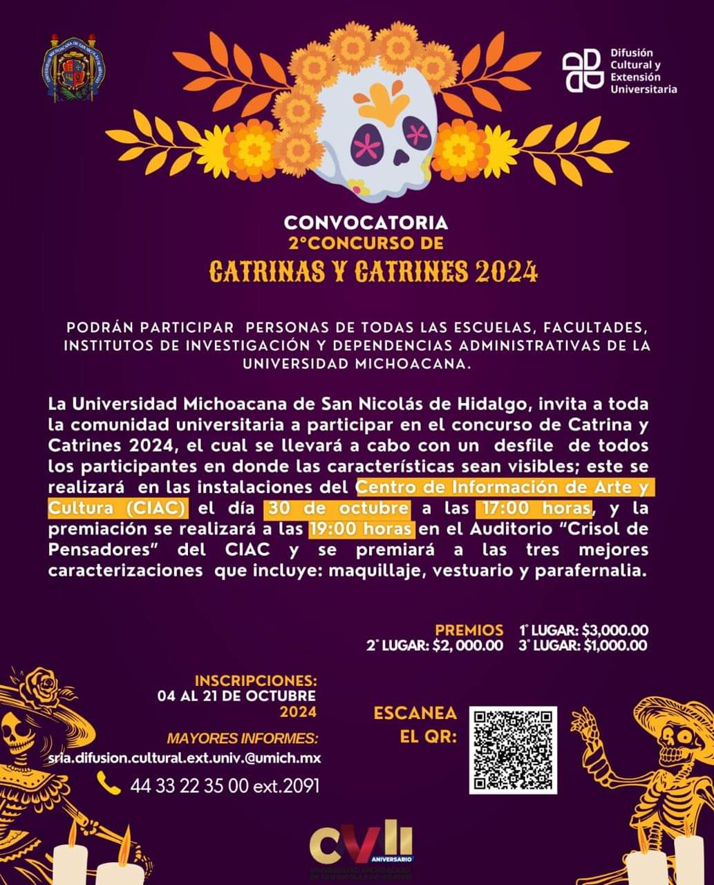 También la propia dependencia universitaria está convocando al 2do concurso de Catrinas y Catrines 2024, en el que podrán participar toda la comunidad nicolaita. Este concurso tendrá lugar con un desfile de todos los participantes en donde las características sean visibles, y será en las instalaciones del CIAC el 30 de Octubre por la tarde.