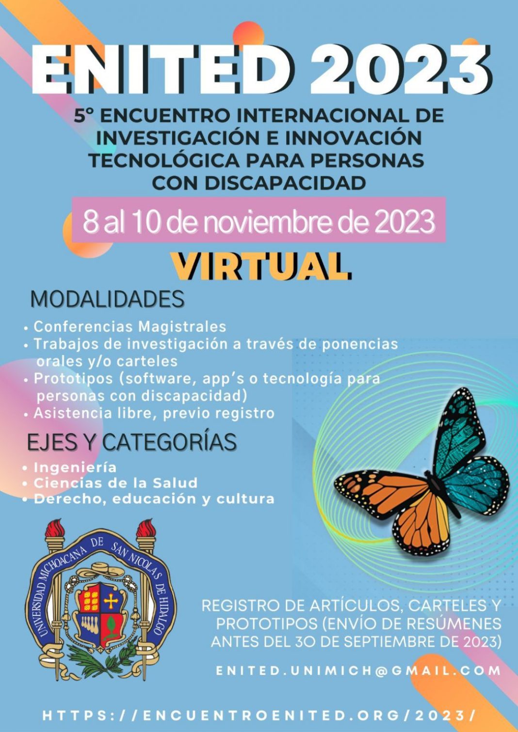Mayores informes en las páginas: https://encuentroenited.org/2023/ y https://fie.umich.mx/enited, en el correo electrónico: enited.unimich@gmail.com, así como al teléfono 443 3223500 extensiones 1113 y 1115.