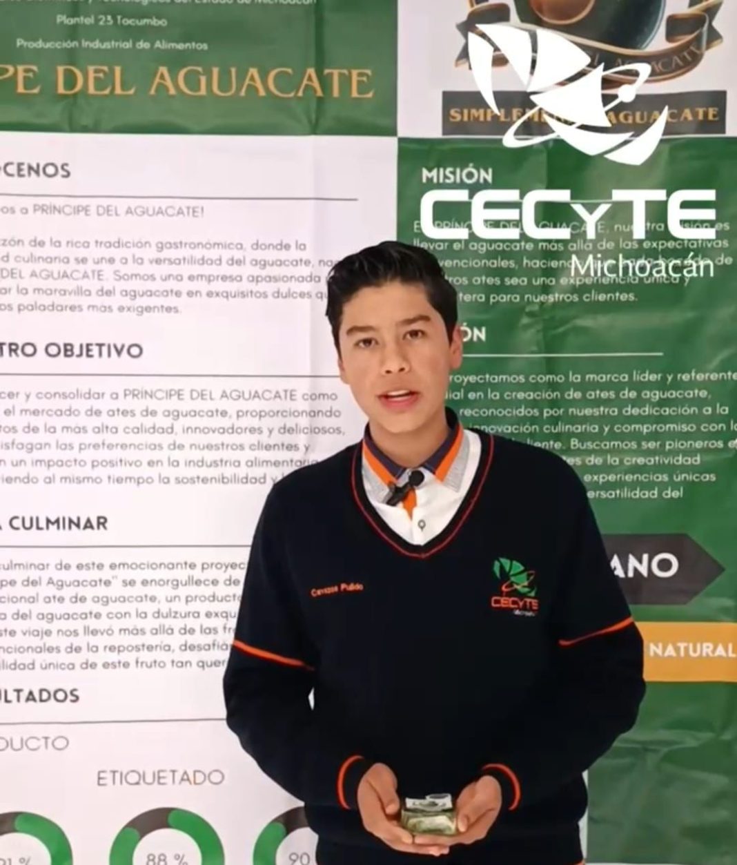 Tocumbo, Michoacán.- Moroni Cavazos Pulido, alumno del plantel 23 Tocumbo del Colegio de Estudios Científicos y Tecnológicos del Estado de Michoacán (Cecytem), realizó el proyecto denominado Príncipe del Aguacate, Ate de Aguacate.