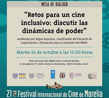 En el marco del festival, en colaboración con el Programa de las Naciones Unidas para el Desarrollo (PNUD) y la UNAM Centro Cultural Morelia se realizará la mesa de diálogo “Retos para un cine inclusivo: discutir las dinámicas de poder” la cual será moderada por Edgar Esquinca, coordinador del Proyecto de Capacitación y Formación para la Inclusión del PNUD.