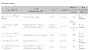 La oferta de la Universidad Michoacana suma 52 licenciaturas y en varias de ellas se ha reducido la capacidad de admisión notablemente como en Arquitectura que tiene ahora 715 lugares de cupo. Derecho mantiene su oferta de mil 200 lugares tan solo para Morelia en modalidad presencial lo que la hace la carrera con mayor cupo y disponibilidad de recepción de nuevos alumnos. En tanto Medicina oferta un cupo de 570 nuevos alumnos: 520 a admitir originarios de Michoacán y 50 que vengan de fuera de la entidad. Otra de las que son muy solicitadas como las anteriores, Médico Veterinario Zootecnista, redujo su oferta a 375 nuevos espacios.