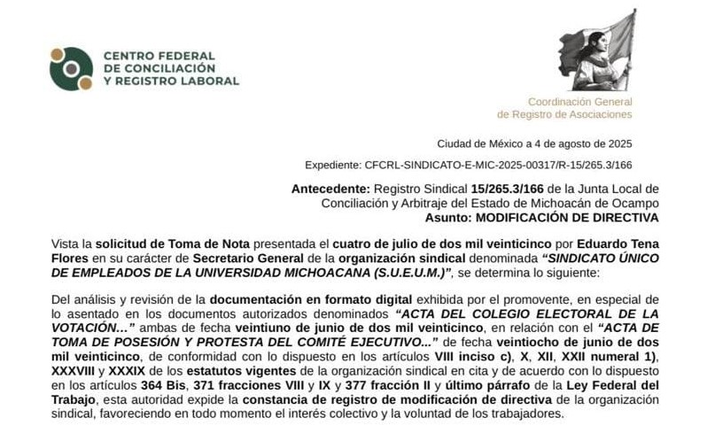 Es así que el órgano federal laboral ha entregado el documento de toma de nota que reconoce la personalidad jurídica y legal de la dirigencia sindical del SUEUM, confirmó esta tarde la vocería sindical, teas definir que esto es un avance significativo y un logro como sindicato que le da toda la potestad para ejercer su derecho y exigir a las autoridades lo que les pertenece, en representación de toda la planta de empleados tanto manuales como administrativos de la UMSNH.