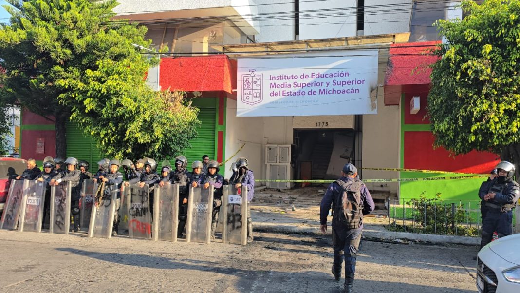 Presuntos normalistas vandalizan edificio del Iemsysem y queman vehículo, en Morelia