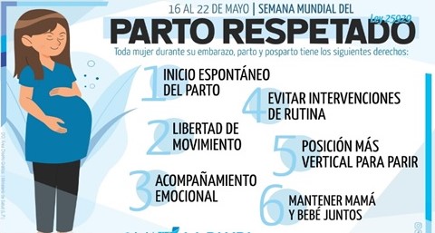 Semana Mundial del Parto Respetado. Cada tercera semana de mayo se celebra del 13 al 20 de mayo en todo el mundo la Semana Mundial del Parto Respetado, con la finalidad de velar por los derechos de las mujeres gestantes desde el embarazo, el parto y postparto, respetando las necesidades y tiempos de las madres parturientas.