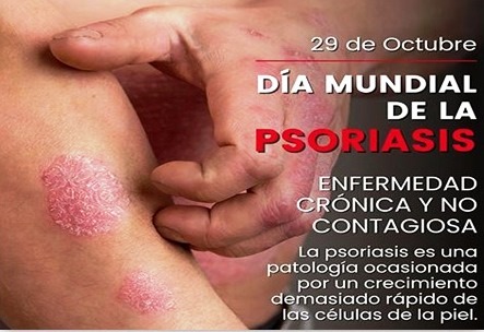 Día Mundial de la Psoriasis. La psoriasis es una enfermedad crónica que causa inflamación y descamación de la piel, produciendo parches, enrojecimiento, escamas, picor, dolor, calentamiento, coloración e hinchazón. Puede afectar cualquier área del cuerpo, aunque es frecuente en las rodillas, codos, espalda, brazos, piernas y cuero cabelludo.