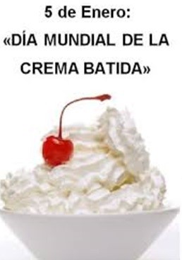 Día de la Crema Batida o Nata Montada. En víspera de Reyes, esta nata montada puede ser un ingrediente de la riquísima rosca de reyes que se consume por estas fechas.