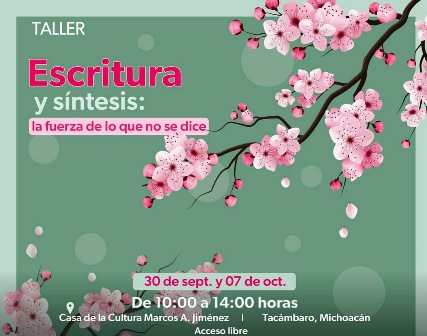 30Analizar textos de difícil clasificación y explorar distintos géneros literarios, son algunas de las actividades que se realizarán en el taller “Escritura y síntesis: la fuerza de lo que no se dice”, que la Secretaría de Cultura de Michoacán (Secum) ofertará del 30 de septiembre al 7 de octubre, de 10:00 a 14:00 horas, en la Casa de la Cultura Marcos A. Jiménez, de Tacámbaro.