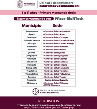 Del 2 al 15 de septiembre, menores de 5 a 11 años de 73 municipios del estado serán vacunados contra el COVID-19 en primeras y segundas dosis con el biológico Pfizer-BioNTech.