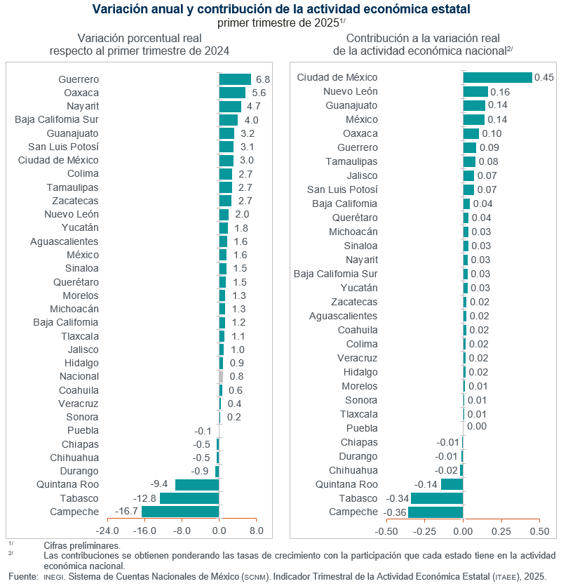 Durante el primer trimestre de 2025 y con cifras ajustadas por estacionalidad, las entidades federativas que registraron crecimientos en su actividad económica, a tasa trimestral, fueron Sinaloa, con 7.0 %; Nayarit, 3.3 %; Guerrero, 2.4 %; San Luis Potosí, 2.3 %; Zacatecas, 2.2 %, y Michoacán, con 2.0 por ciento.