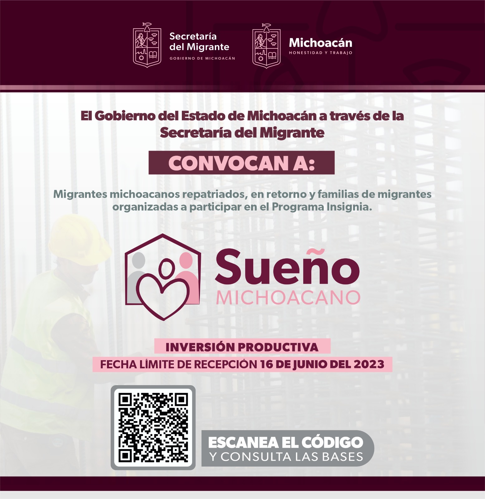 Morelia, Michoacán.- Con el objeto de fomentar la generación de empleo y la reintegración al campo laboral de las y los michoacanos migrantes y sus familias en el interior del estado, la Secretaría del Migrante (Semigrante), informa que se abre la convocatoria a las personas que deseen participar en el Programa Sueño Michoacano en su vertiente de inversión productiva.