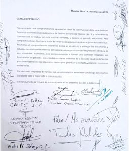 Por último, firmaron tras aceptar una carta compromiso, misma que asienta: «por este medio, nos comprometemos a pausar las obras de construcción de la estación 6 del teleférico de Morelia ubicada junto a la Escuela Secundaria Técnica No. 3, y retomando la construcción al finalizar el ciclo escolar corriente, y durante el periodo vacacional», asumiendo el compromiso de reparar los daños en el edificio, a entregar los dictámenes y estudios necesarios elaborados y por elaborarse que garanticen la integridad del plantel y de sus ocupantes.
