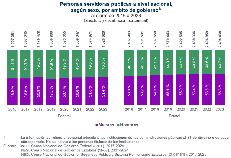 Al cierre de 2023, se registraron un millón 620 mil 828 personas servidoras públicas que laboraban en la Administración Pública Federal (APF) y 2 millones 406 mil 436 en las administraciones públicas estatales. En el ámbito federal, el número de personas servidoras públicas aumentó 3.4 % respecto al cierre de 2016. En el estatal, se observó en 2023 el menor número de servidoras y servidores públicos en el periodo 2016-2023. Por otra parte, la participación de las mujeres en el servicio público superó 50 % en los dos ámbitos de gobierno, al cierre de 2023.