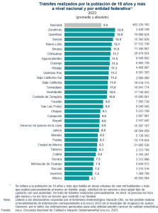 En 2023, a nivel nacional, las personas de 18 años y más de áreas urbanas realizaron personalmente 402 millones 225 mil 102 trámites, un promedio de 9.4 trámites por persona. Zacatecas, Querétaro, Sonora y Nuevo León fueron las entidades federativas que registraron los promedios más altos, superiores a 12 trámites por persona.