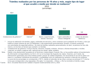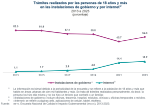 Entre 2013 y 2023, la proporción de trámites realizados por las personas de 18 años y más en las instalaciones de gobierno disminuyó de 62.5 % a 52.4 por ciento. En contraste, el uso de internet como medio para realizar trámites gubernamentales aumentó de manera importante en el periodo, al pasar de 1.1 % a 16.2 % de todos los trámites realizados en el periodo.
