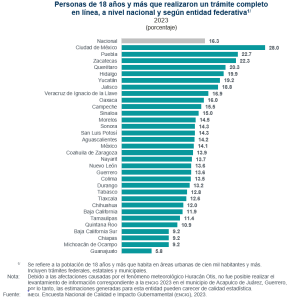 En 2023, a nivel nacional, 16.3 % de la población de 18 años y más de áreas urbanas realizó un trámite completamente en línea, desde su consulta hasta la solicitud o el pago de este. Ciudad de México, Puebla, Zacatecas y Querétaro fueron las entidades federativas que destacaron por tener los porcentajes más altos de personas de 18 años y más que manifestaron haber realizado un trámite por completo en línea.