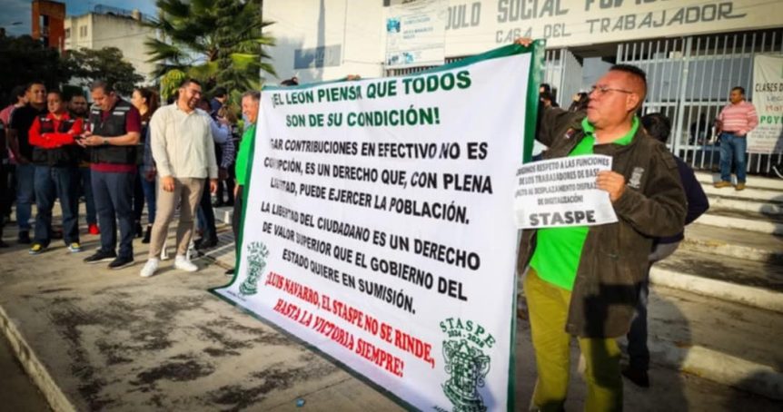 Al grito de «STASPE en unidad defiende su dignidad» y la consigna de «va a caer, va a caer, Navarro va a caer», trabajadores al servicio del Poder Ejecutivo del estado se manifestaron esta tarde en contra de la imposición que quiere hacer el gobernante Alfredo Ramírez Bedolla de obligatoriedad a nivel constitucional de que todos los pagos de servicios e impuestos sean vía digital.
