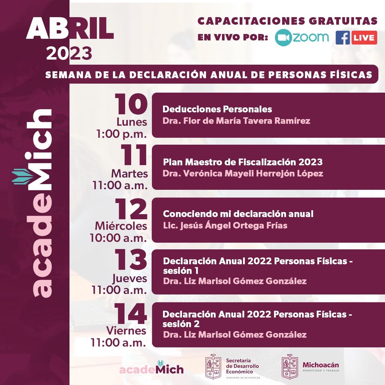 Los temas serán presentados a través de la estrategia acadeMich en formatos presencial y virtual; el lunes 10 corresponderá a la doctora Flor de María Tavera Ramírez, abordar el tema Deducciones Personales, en una charla que dará inicio a las 13:00 horas.