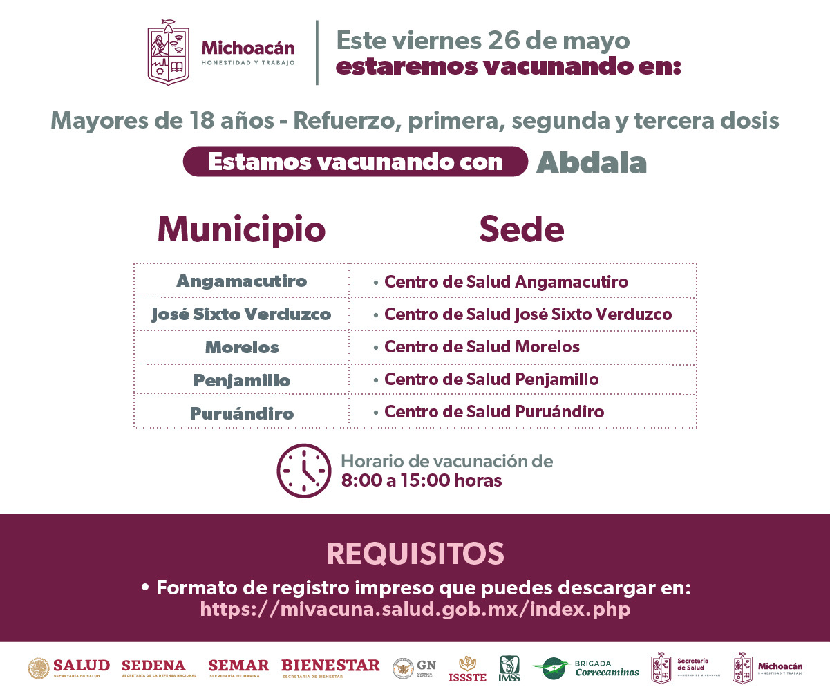 También se vacunará a pobladores de Apatzingán, Buenavista, Churumuco, La Huacana, Múgica, Parácuaro y Tepalcatepec, en un horario de atención de 8:00 a 14:30 horas, las sedes podrán ser consultadas a través de la página de Facebook de la Secretaría de Salud de Michoacán (SSM).