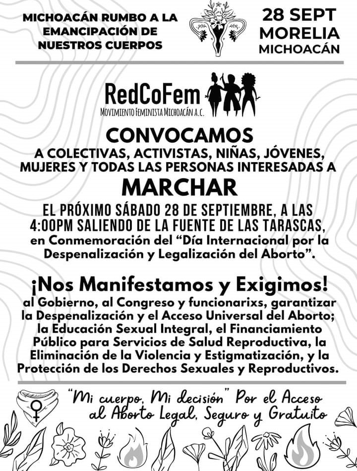 La Red Colectivas Feministas Michoacán (Redcofem), ha convocado a una movilización masiva el próximo 28 de septiembre, con motivo del Día Internacional por la Despenalización y Legalización del Aborto.