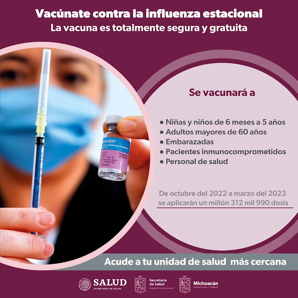 Recordar que el pasado 3 de octubre del 2022, en Michoacán y en todo el país arrancó la campaña de vacunación contra la influenza que comprende de octubre del 2022 a marzo del 2023, donde la meta del sector salud era aplicar un millón 312 mil 990 dosis del biológico, de este total SSM aplicaría 582 mil 482.