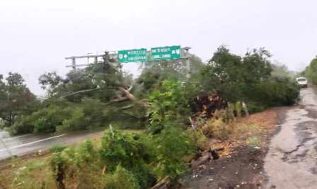 Gabriel Zamora, Mich.- 07 de julio de 2023.- La tarde de este viernes, varios árboles de gran tamaño cayeron sobre la Autopista Siglo XXI, obstruyendo ambos carriles, lo que derivó en el cierre de dicha vialidad.