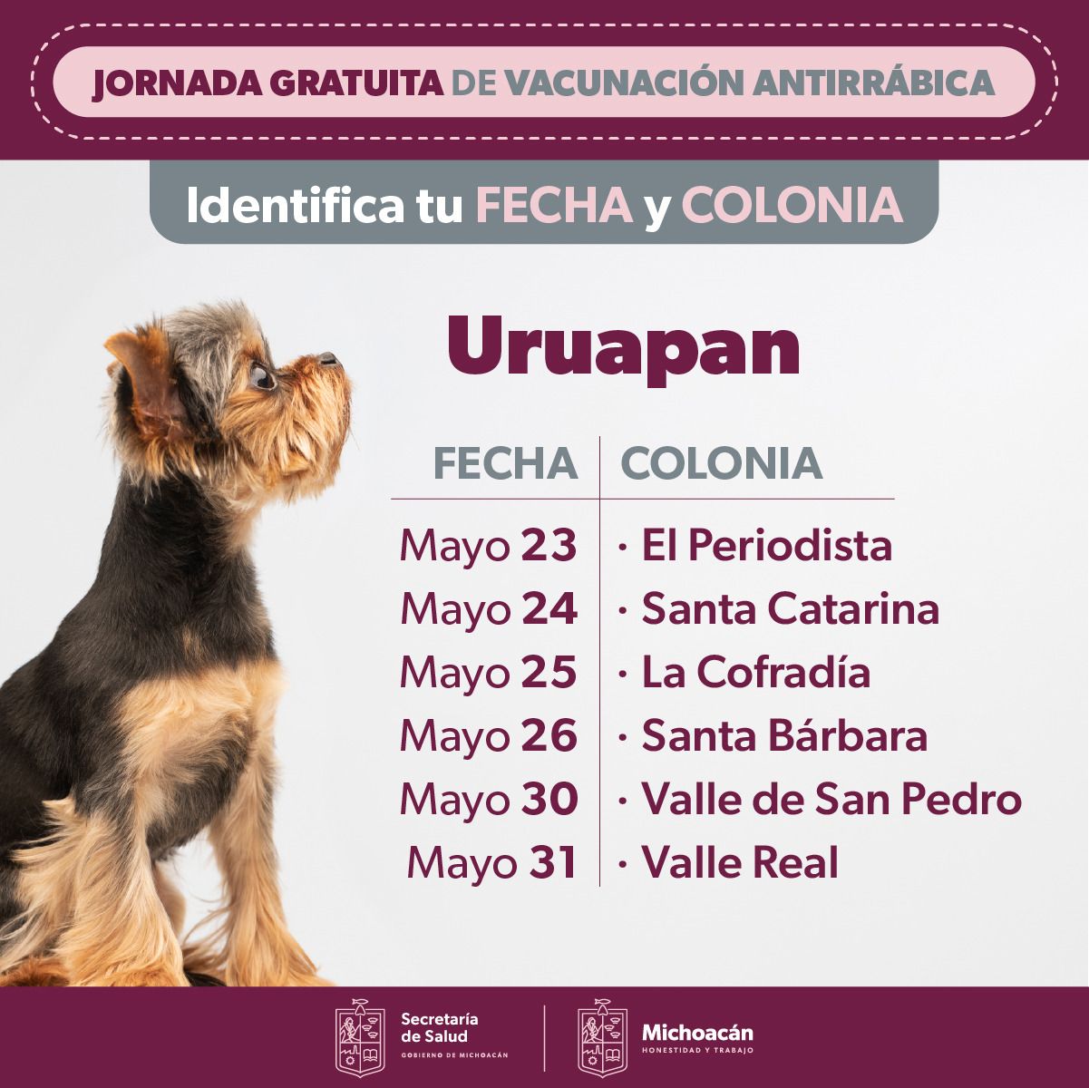 El jueves 1 de junio en la colonia 22 de Octubre, el viernes 2 en La Cedrera, el martes 6 en la colonia Doctores, el miércoles 7 en La Antorcha, el jueves 8 en Taximacuaro, el viernes 9 en Santa Rosa, el martes 13 en la 18 de Marzo, y el miércoles 14 en la Constituyentes.