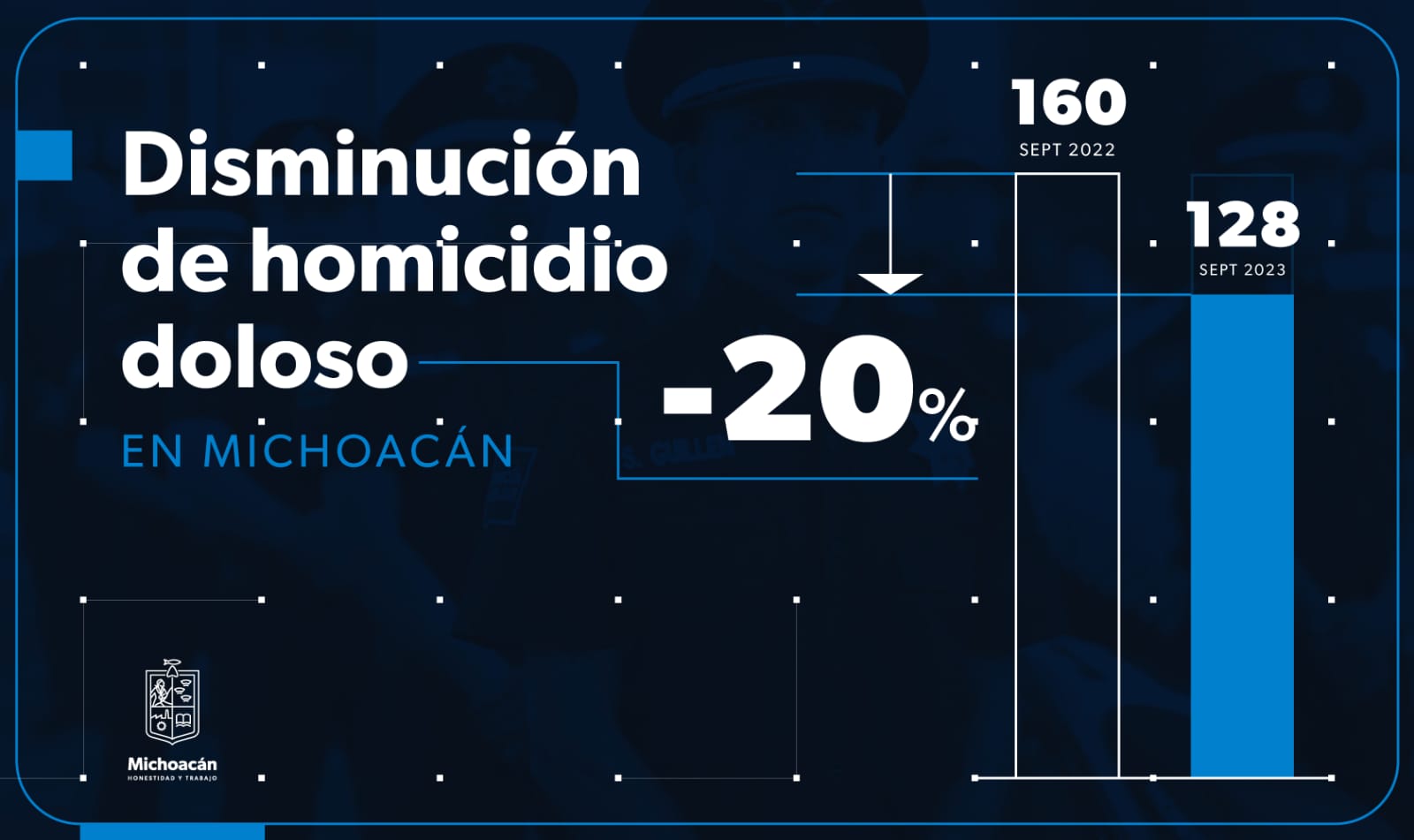 El gobernador Alfredo Ramírez Bedolla, informó a través de sus redes sociales que en septiembre de 2022 se registraron 160 crímenes, 32 menos en este año, apenas el mes pasado.