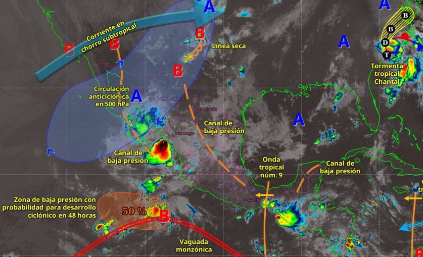 El avance de la onda tropical núm. 9 sobre el sureste y sur del país, generará lluvias puntuales muy fuertes en Chiapas y Oaxaca; y puntuales fuertes en Tabasco y Veracruz. A su vez, la entrada de aire húmedo del mar Caribe en interacción con un canal de baja presión sobre la península de Yucatán, originará lluvias puntuales fuertes en Quintana Roo, Yucatán y Campeche. Por otra parte, una zona de baja presión con probabilidad para desarrollo ciclónico se desplazará al suroeste de las costas de Jalisco, sin afectar a costas nacionales. Finalmente, continuará el ambiente caluroso a muy caluroso por la tarde sobre entidades del noroeste de México.