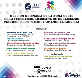 La Comisión Estatal de los Derechos Humanos en Michoacán será sede de la II Sesión Ordinaria de la Federación Mexicana de Organismos Públicos de Derechos Humanos zona oeste, misma que se realizará los días 29 y 30 de junio en la capital michoacana.