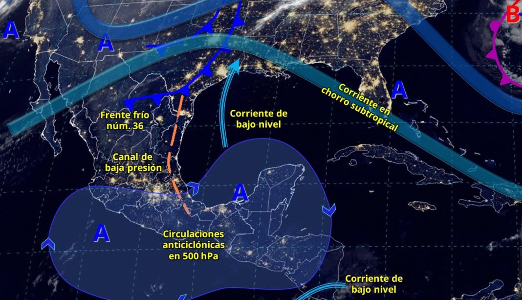 Durante este día, el frente frío núm. 36 se desplazará sobre el noreste y oriente del país, y en interacción con un canal de baja presión sobre el sureste de la República Mexicana y con las corrientes en chorro polar y subtropical, originará lluvias e intervalos de chubascos en el noreste, centro, oriente y sureste de México; así como vientos fuertes a muy fuertes en el noroeste, norte, noreste, oriente y centro del territorio nacional.