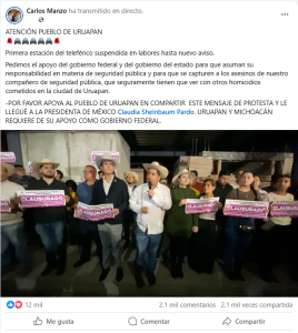 -por favor apoya al pueblo de Uruapan en compartir  este mensaje de protesta y le llegué a la presidenta de México Claudia Sheinbaum Pardo. Uruapan y Michoacán requiere de su apoyo como gobierno federal.