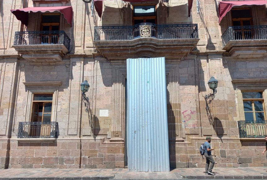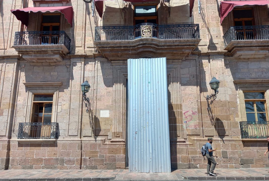 En el marco de la marcha del 8M en Morelia, colocan protección metálica a la puerta de Palacio de Gobierno.