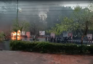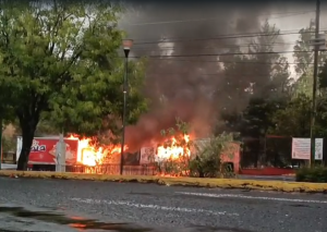 La circulación fue reabierta y los inconformes se retiraron, pero cerca de las 18:30 horas regresaron en 4 autobuses y una patrulla de la Policía Comunal, descendieron de sus unidades y usando un camión de carga derribaron un segundo portón de acceso a Casa Michoacán, para enseguida prenderle fuego a la unidad motriz y al camión repartidor con el tumbaron el primer portón.
