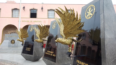 Se compone por seis pilares donde se inscribieron los nombres de cada uno y tienen un águila elaborada por placas de metal en color dorado