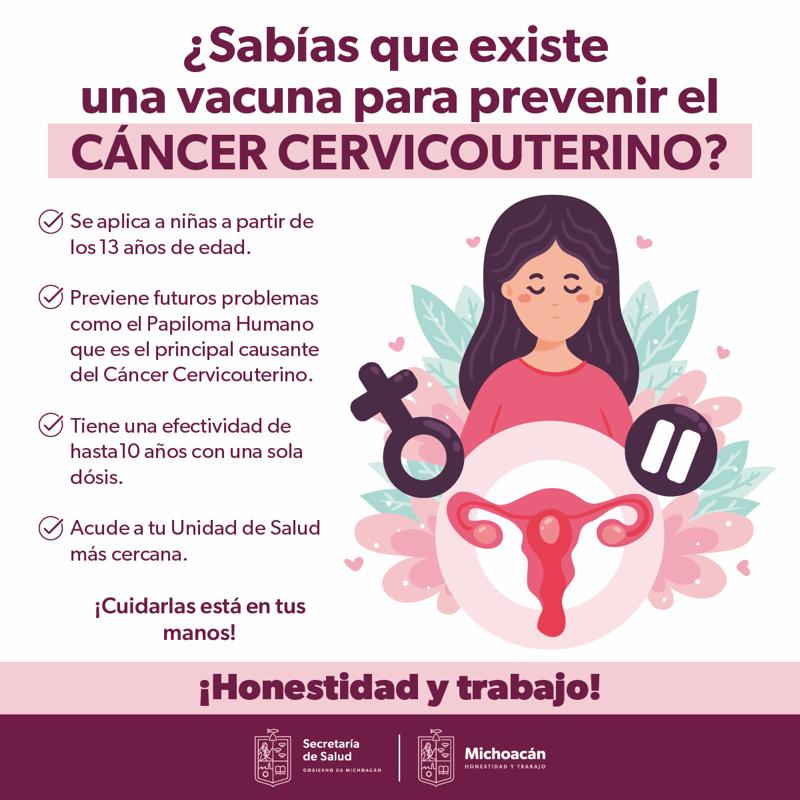 Morelia, Michoacán.- El Gobierno de Michoacán protege del cáncer cervicouterino a todas las niñas de 13 y 14 años de edad con la aplicación de la vacuna contra el Virus del Papiloma Humano (VPH), disponible en los centros de salud.